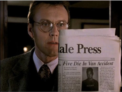 Buffy tells him Buffy’s not home, and tries to close the door, but Giles shoves a newspaper in her face. Five people die in a car crash, five die, just like the prophecy says!