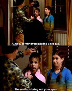 Willow is helping Buffy pick a date outfit, and they are getting Xander’s opinion for some reason. He suggests Buffy wear a giant coat and a ski cap.